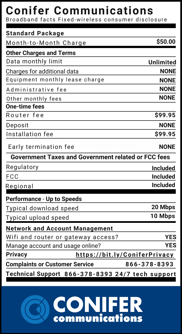 At Conifer Communications, we understand the need for reliable, fast internet – even in the most remote corners of our beautiful counties. That’s why we’re here, offering affordable plans tailored to your needs. Join us in bridging the digital divide, one connection at a time.